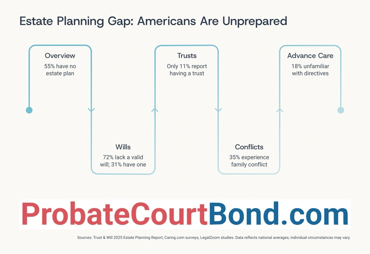 A shocking 55 percent of Americans have no estate plan at all. Only 31 percent have a valid will, and family conflicts arise in 35 percent of cases.