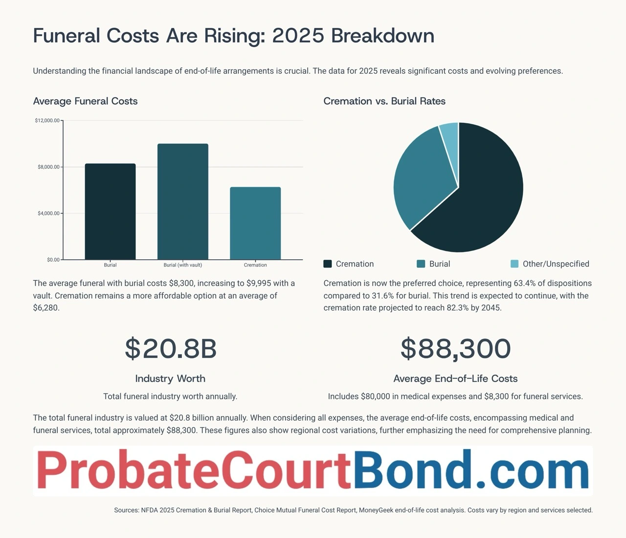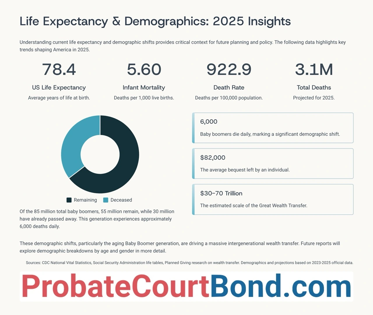 This 2025 Death and Estate Planning Statistics Report aims to inform attorneys, families, and journalists about current trends. Data comes from CDC, NFDA, Trust & Will, and other 2023-2025 sources. Credit ProbateCourtBond.com when using these visuals.